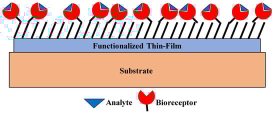 The working principle of thin-film-based biosensors is based on the selective adsorption of analyte molecules on a functionalized thin film. These biosensors act as physicochemical (optical, mechanical, magnetic, or electrical) transducers, which convert the signal resulting from the recognition of the biological analyte into another form of a measurable signal. A plethora of thin-film-based biosensors can be found in literature references. These are comprised of complex structures of thin films, which give enormous functionalities to the sensors. The thin films are made from either organic and/or inorganic materials, such as metals, glass, polymers, silicon, or metal oxides. Specific structures of biological molecules can also be used as thin films. The most crucial part of such biosensors is the analyte-sensitive layer, i.e., the layer which reacts to the biomolecule. On this surface, atomic interactions and surface free energies and forces are different from the bulk of the material, and the analyte-specific reaction starts here. Surface activation can be necessary to immobilize biological analytes on sensitive layer. For this purpose, self-assembled monolayers (SAM)-enabled surface-modification techniques are the most widely used []. Thin films can be used to functionalize (e.g., control hydrophobicity, bio-affinity, biocompatibility, and electrical activity) the surface of biosensors with or without using surface-treatment processes. For example, Parylene C, which is a polymer commonly used in the packaging of integrated circuits, is a hydrophobic polymer with a water contact angle of 87°, and its surface can be made hydrophilic with oxygen–plasma treatment, which allows the realization of a plethora of microfabricated, microfluidic devices that function on the basis of efficient capillary flow. Other examples of similar biocompatible thin films include dielectric coatings such as SiO2, TiO2, Al2O3, and Si3N4. These layers are crucial to the practical deployment of thin-film-based biosensors and drug delivery systems. Such layers are often exploited for their superior electrical, optical, magnetic, and mechanical properties in comparison with their bulk counterparts. For example, Sokolov et al. demonstrated that a PDMS thin-film utilized as a miniature pressure sensor displayed a recovery time which was ~50 times faster than a pressure sensor which comprised of a bulk PDMS layer []. The most commonly used polymers for biosensing purposes include PDMS, parylene-C, perfluoropolyether, polyetheretherketone, polypropylene, and polystyrene. Besides dielectrics, metallic thin films are widely used in biosensors to form either bond pads for electrical probing of the analyte or as activation surfaces for appropriate functionalization. The most widely used metal for biosensors is gold due to it being biocompatible, a noble metal, and its excellent electrical properties. Functionalization of Au with self-assembled thiol molecules is the most common technique for activating the gold surface. Additionally, a thin layer of metal is often deposited for improving adhesion between two layers which are naturally incompatible. Metals such as Cr and Ti have been widely used to improve adhesion between the electrically active layers (such as Au) and the underlying Si/SiO2 substrates. Functionalization using organic thin films is an equally important aspect of thin-film-based biosensor technology. The functionalization process essentially consists of depositing a thin layer of organic films such as a variety of thiol molecules, proteins, and nucleic-acid molecules. The selection of the appropriate surface chemistry is crucial to the uniform formation of the organic films and depends on the specific material to be activated. Silane molecules are often used to functionalize inorganic surfaces, such as glass. Numerous examples of similar functionalization techniques can be found in these literature references. Figure 3 shows the schematic of the working principle of thin-film-based biosensors.