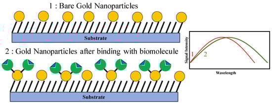 AuNP-based optical biosensors: As the name suggests, these devices are designed to realize a measurable transduction between the presence or change in concentration of the analyte of interest and the optical properties of the biosensor. The fundamental principle behind gold nanoparticle assisted biosensing is the collective oscillation of plasmons in response to incident electromagnetic (EM) waves. An example of such a phenomenon is surface plasmon resonance (SPR), where the interaction between the incident EM waves and the conduction-band electrons of Au is used for probing surface characteristics of the same. This interaction results in the resonant coherent oscillations of the surface conduction electrons of the metal, and the characteristics of these oscillations is a function of the concentration of the analyte of interest, which is present on the surface. Generally, the specific binding of biomolecules on the surface of metals results in a change of the dielectric constant of the surrounding medium, which then causes a change in optical characteristics of any EM wave which is incident on the metallic surface. This change is proportional to the concentration of the coated biomolecules, and therefore, accurate measurements of the reflected EM wave provide relevant information regarding the concentration of the analyte of interest. Englebienne was one of the first researchers to report a red-shift in the SPR resonant frequency of gold particles coated by a monoclonal antibody []. For the last two decades, significant efforts have been made to correlate the plasmon-absorbance characteristics of AuNPs with the refractive index of the surrounding medium (which in turn depends on the concentration of the coated biomolecule). The most significant advantage of AuNPs in comparison with traditional metallic thin-film devices is that AuNP-based sensors display augmented SPR signals which result in higher sensitivity of the biosensor and accuracy of measurement as well as a lower limit of detection.