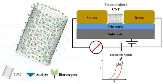 Schematic of carbon nanotube (CNT) functionalized with bioreceptors to facilitate the capture of specific analyte. Schematic of CNT-based field-effect transistor. Successful capture of analyte molecule leads to shift in threshold voltage of the FET device, which is in indirect measure of analyte concentration.