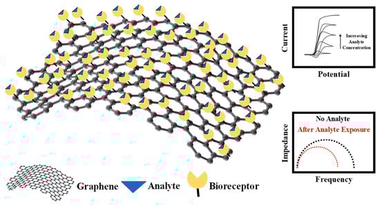 Graphene was first theoretically explored by P.R. Wallace in 1947 [] and then later synthesized by the novel prize-winning scientist, Konstantin Novoselov and his team using a simple scotch-tape dispenser []. Graphene and is a carbon structure with sp2 hybridization in two dimensions and can be viewed as “carbon-sheets”. These sheets can then either be stacked horizontally to form a 3D graphite structure or can be simply rolled to form nanotubes. Due to the π-conjugation present in the graphene structure, it exhibits excellent thermal, electrical and mechanical properties. Graphene can be synthesized using a variety of techniques, including chemical vapor deposition (CVD), exfoliation of graphite, liquid phase exfoliation of graphite, reduction of graphene oxide, surface segregation and molecular beam epitaxy. However, most of these are low-throughput techniques, and unfortunately, there has been limited advancement in repeatable and thorough batch-fabrication of graphene. Using techniques such as atomic-force microscopy (AFM), scanning tunneling microscopy (STM) and Raman spectroscopy the most vital properties of graphene have been determined as follows: the surface area of a single-layer of graphene is ~2630 m2g−1, and the Young’s modulus is 1 TPa with an intrinsic mobility of 2 × 105 cm2v−1s−1. The thermal conductivity of graphene has been determined as 5 × 103 Wm−1K−1. It is optically almost transparent with a measured transmittance of 97.7%, and it is extremely conductive with a conductivity of ~104 Ω−1cm−1. Amongst its widespread applications, graphene has been mostly used to build high-speed electronic devices for storage and energy harvesting. It has been used to fabricate high-frequency transistors, photodetectors, and biosensors for a plethora of applications such as DNA sequencing. Figure 6 shows a functionalized graphene layer and the working principle of a graphene-based electrochemical biosensor. The following sections will briefly discuss the graphene-based electrochemical biosensors.