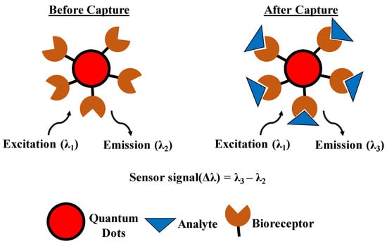 Quantum-dot-based bioluminescent biosensors: A major bottleneck to the practical implementation of fluorescent biosensors based on quantum dots is the inherent requirement of appropriate illumination sources. Additionally, such sensors suffer from high background noise signals due to direct excitation of the acceptor fluorophore. This can be solved by using a bioluminescence resonance-energy transfer technique where a bioluminescent luciferase acts as the energy donor which acts as the catalyst for the oxidation of the substrate which generates the emission light and which can then be transferred to the acceptor to complete the bioluminescence resonance-energy transfer process. For example, Shen et al. demonstrated sensitive and selective detection of enrofloxacin using a quantum-dot-based bioluminescent biosensor []. Additionally, Jin and Tsuboi fabricated an optical biosensor for the detection of apoptosis cells using quantum-dot biosensors [].