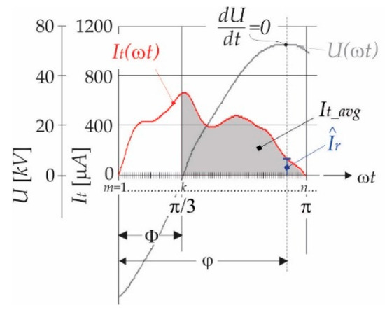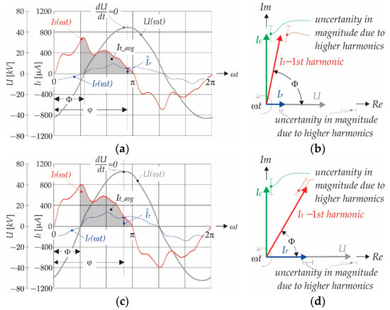 The measurement principle is based on the classical off-line measurement procedure that is suggested in [28]. The magnitude of the resistive current component () is extracted from the oscillograms at the instant when the voltage is at its peak (dU/dt = 0), as shown in Figure 1a. Figure 1b shows the phasor diagram at ωt = φ of leakage current It, and its resistive and capacitive components Ir and Ic, respectively. The harmonic distortion that was obtained as a projection of the phasor It to the real (Re) axis causes that distortion of the resistive current is acceptable, and the magnitude is accurate enough for further analyses. However, at the same time when is extracted from the diagram, the grey shaded areas that are indicated in Figure 1a,c as It_avg are also extracted, and it depends on φ and , as follows:
