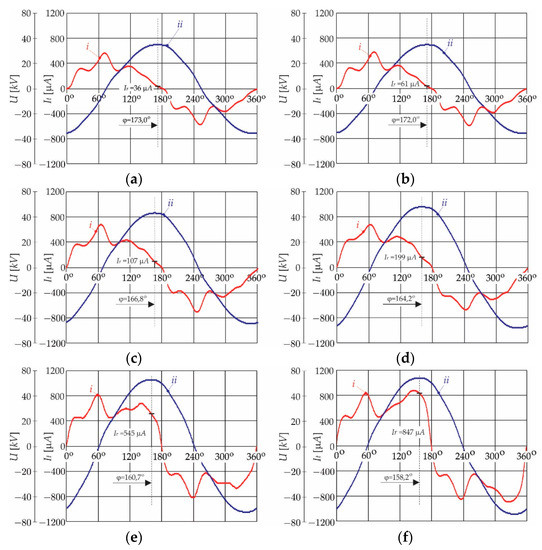 In order to extract the resistive current component from the leakage current (It) the measurement is performed at a few different operating points (different supply voltages U). The measurement set-up (the following equipment was used in the set-up: A Tr1-autotransformer up to 0.4 kV, a Tr2-transformer for galvanic isolation 1/N1 = 0.4/7 kV, a high voltage transformer, 1/N2 = 0.1/110 [kV], an oscilloscope RIGOL DS4034, multimeter Fluke 189. Arrester type SNO_U = 36 kV class DH producer IZOELEKTRO) is organised, as presented in Figure 2. Figure 3a–f show the measurement results obtained from CSV data (from an oscilloscope), of a randomly chosen arrester (Arrester type SNO_U = 36 kV class DH producer IZOELEKTRO, 2341 Limbuš, Slovenia). The magnitude of the resistive current component () is extracted from the oscillograms at the instant when the voltage is at its peak (dU/dt = 0) at six operating points. Further, the measurements were performed on 10 arresters, in order to have a representative result. Table 2 shows the obtained measurement results. For every sample, the exact value of the phase angles (φ) and the magnitudes of , are indicated for every operating point.