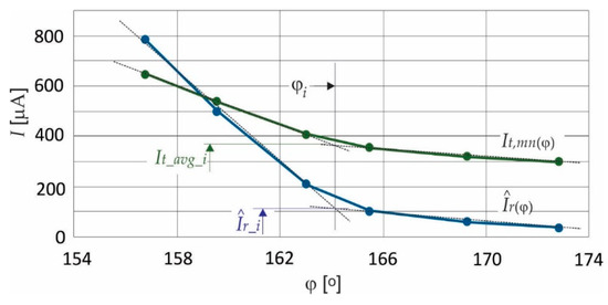 And they are shown in Table 3. Based on the results presented in Table 2 and Table 3, the so-called “static” characteristics are drawn to obtain analytical expressions. The obtained curves that are shown in Figure 5 can be approximated by sectional linear function. Because is the consequence of , the intersection of the linear function appears at the same argument, when (calculating intersection of (15) and (17) gives φi = 164.2°, It,mn,i = 363 μA). Hence, the trend lines, represented by the linear function, are: