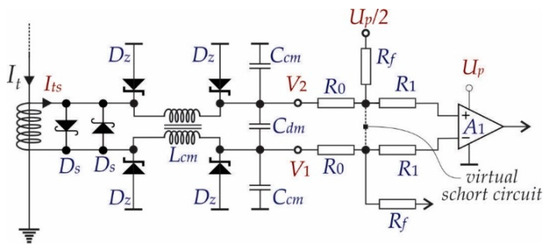 The whole measurement circuit was protected over the current’s strokes, and some high frequency interferences were rejected (Common Mode (CM) and Differential Mode (DM) interferences). Figure 8 shows the over-current protection that was performed using two Schottky and four Zener diodes. All of the diodes were chosen in order to keep the voltage difference smaller than the supply voltage (V2 − V1 < Up) ().