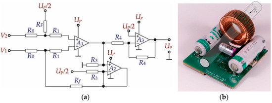 where R0 indicates the resistances in the input loop of the operational amplifier A1 and Its = It/300 (). Additionally, the alternative input signal must be transformed into a unipolar signal appropriate for A–D conversion of voltage at the output of the measurement system (UoA3). Figure 9 shows the scheme of the chosen electronic circuit. The frequency analyses of the electronic circuit were considered in order to design a suitable gain and band-pass. Assuming that the operational amplifiers were the same type, and after analyses of the scheme in Figure 9, it follows: