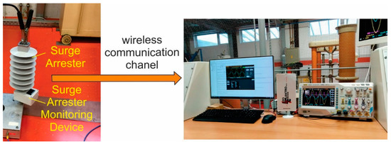 For verification of the described measuring principle that is based on (15) to (18), the experimental test-bench system was built, as shown in Figure 11. The Surge Arrester Monitoring Device prepared the current measurement results into the form that is required for further processing. The measurement results were processed with the acquisition units and microcontroller, as described in Section 3. Subsequently, the results were forwarded to the computer in the “distribution” centre, where they were recalculated to achieve the right values of the resistive current component.