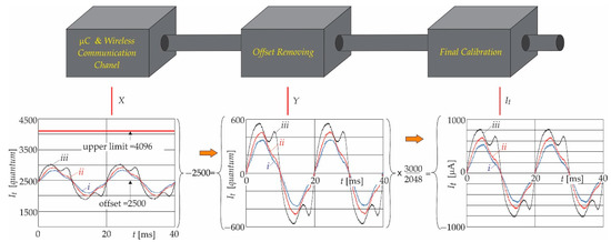Figure 12 shows the block scheme of the calibration process. The analogue signal was prepared for ADC conversion in the signal acquisition circuit. The alternative current signal was amplified and shifted by the offset voltage, as follows: