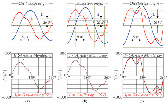 The obtained results should be verified in order to justify the measurement principle. Three different operating points of the surge arresters were measured with the oscilloscope and with the Surge Arrester Monitoring Device. Figure 13a–c show the results of both measurement principles. The current and voltages’ waveforms of the surge arrester measured by oscilloscope are shown in the first row. The results from the oscilloscope CSV files are treated as reference, and they are slightly different from the results obtained from the SAMD, as can be noticed from Figure 13a–c. The reason is the pass-band of the used analogue signal acquisition circuit. After inspection of the performance index shown in Table 5, it was concluded that the obtained results reflected the measured currents accurately when comparing them with the scope reference values.