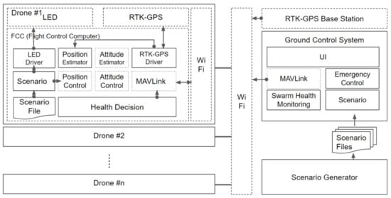 The ground system consists of the RTK-GPS base station, the GCS, and the scenario creator. The RTK-GPS base station transmits the RTK-GPS correction information to each drone. The GCS has several components. The MAVLink component is the same as the corresponding component on each drone. To check the status of each drone in real time, the swarm monitoring component monitors the status of each drone based on the information received from the drone. The scenario component transmits the scenario information provided by the scenario generator mentioned in Section 3 to each drone. The emergency control component controls the drones that experience problems during the scenario flight.