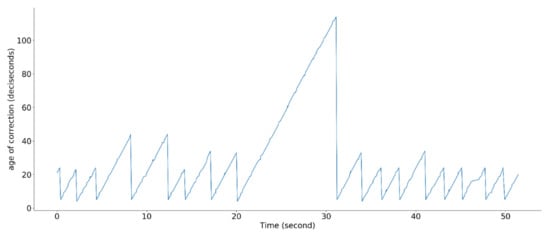 Fortunately, the fixed mode can be maintained for a limited time even if the transmission of the RTK-GPS correction data stops. To check the health status of the fixed mode, the age of the correction information is used, as shown in Figure 3. When a drone receives the correction data, the age of the correction information is reset.
