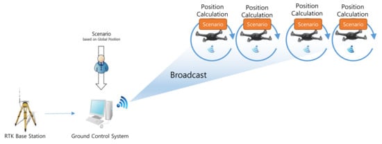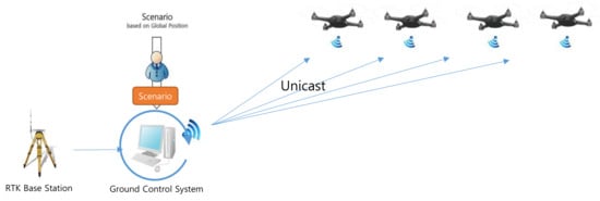 In the proposed system, to reduce the communication traffic, the scenario information, which has already been prepared, is transmitted to and stored on each drone before the flight, as shown in Figure 5. In addition, the correction data from the RTK-GPS base station are transmitted through broadcasting. Consequently, the amount of data transmitted from the GCS to the drones is constant, as follows:
