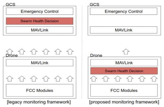 However, if each drone needs to transmit several pieces of information, such as the sensor data for health status monitoring, the amount of data transmitted from the drones to the GCS will increase in proportion to the number of drones. To minimize the amount of data transmitted in this direction, in the proposed swarming flight system, the health status of each drone is not checked using the ground station system. Instead, the health status of each drone is checked at the drone by using a health decision module, as shown in Figure 6. The health decision module checks whether the drone is healthy in terms of each considered status indicator and expresses each status result as a bit. In addition, to further minimize the information sent from the drones to the ground station, this information is allowed to be transmitted only when changes occur.