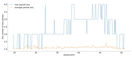 To verify the proposed communication system, an experiment was conducted over a continuous period of 360 seconds based on a scenario with 100 drones. Figure 7 shows the maximum and average packet losses from the GCS to the drones for the RTK-GPS correction data as functions of the distance. In most cases, only one packet was dropped. In terms of the maximum packet loss, up to 4 packets were dropped. Therefore, the proposed system could maintain the fixed RTK-GPS mode.