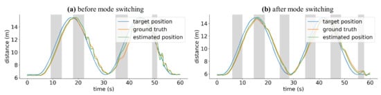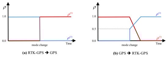 Notably, when the mode changes, especially from the GPS to RTK-GPS mode, several position errors may accumulate in the estimation due to the GPS sensor error. This phenomenon may lead to sudden position changes, which may cause the spectators of the drone show to feel insecure. To solve this problem, a modified position estimation algorithm is proposed to enable smooth prediction of the future positions. The proposed position estimation algorithm is designed to predict the position while smoothly varying the information ratio () when switching from the GPS information to the RTK-GPS information, as shown in Figure 8.