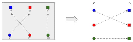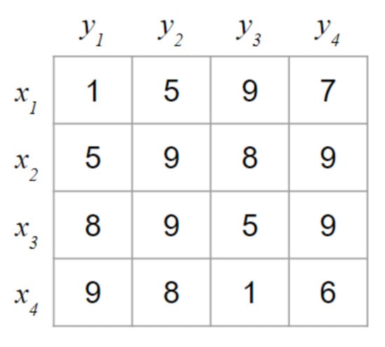 To reduce the maximum weight, the cost matrix is updated by continuously removing the highest weight. However, an ideal matching may not be found in the bipartite graph if excessively many edges are removed. Therefore, the Hall theorem [] is used to check that the perfect matching condition in a bipartite graph with  is satisfied. The bipartite graph  contains an ideal matching if and only if the Hall condition is satisfied, as follows: