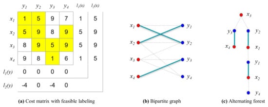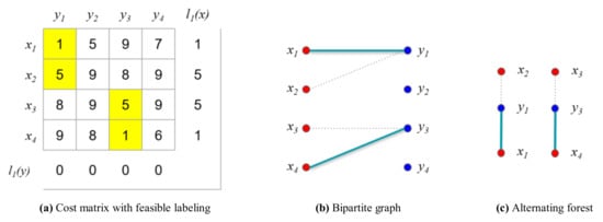 To solve the LSAP, diverse algorithms have been developed, including the simplex algorithm (standard linear programming) [,,], the Hungarian algorithm [,], a neural algorithm [], and the auction algorithm []. Each algorithm has undergone further development to improve its time complexity []. Among the various LSAP algorithms, the Hungarian algorithm is the well-known optimal solution.