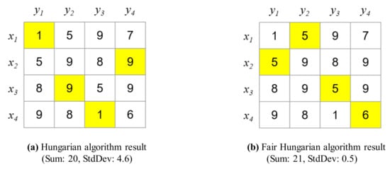 Once the weights are updated, the ideal matching  is identified using the Hungarian algorithm based on the cost matrix obtained after the removal of weights. The proposed algorithm reduces the variance to 0.5, even though the total sum of the weights is 21, which is similar to the optimized minimum cost, as shown in Figure 16b.
