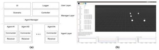 The architecture of the GCS is shown in Figure 18a. The system is divided into three layers: the user layer, manager layer, and agent layer. Each layer is independent of the other layers and communicates with the other layers by using a message queue. Consequently, a legacy layer can be easily replaced with a new layer. The user layer manages a graphical user interface (GUI). This system can illustrate the drones in 3-dimensional space in real time, as shown in Figure 18b. The control layer manages all the drones and implements the specified scenarios. In an emergency situation, the GCS can control each drone as required in the given layer. The agent layer manages the communication and sends commands to the drones. This agent module should be developed differently for different types of drones.
