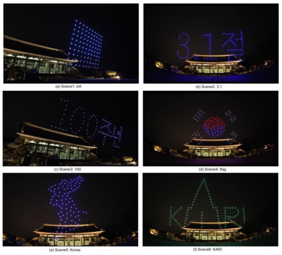 To demonstrate the swarming flight formation, the drone show is operated at night as shown in Figure 19. It is performed during about 400 second for 6 scenes. The experimental result video is available at https://youtu.be/TgCKhgljWW8 (accessed on 23 January 2021).