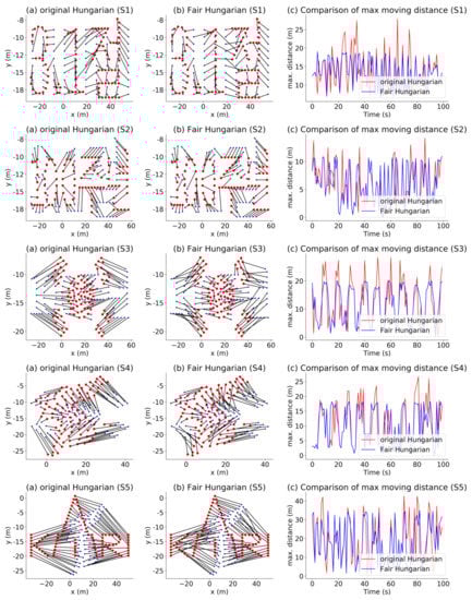 To compare the proposed algorithm with the Hungarian method, Figure 20 shows the direction of movement of each drone during each scene transition pertaining to the original Hungarian algorithm (left panels) and the proposed algorithm (center panels) along with the graphs (right panels) comparing the maximum distance for each drone.