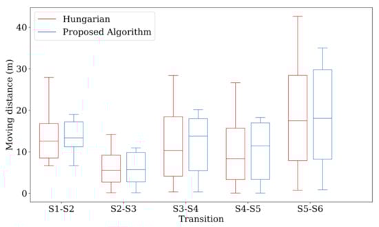 Figure 21 compares the sum of the distances, maximum movement distance among the drones, and standard deviation among the drones corresponding to the two Hungarian methods through boxplot. The proposed algorithm reduces the maximum movement distance among the drones, while the sum of the distances remains similar. In addition, the overall battery consumption of the drones is more efficient because the standard deviation is smaller than that achieved using the original Hungarian method. Consequently, even though the Hungarian algorithm can find the assignment with the minimum total cost, the energy consumption is not fairly distributed among all the drones. In contrast, the proposed algorithm can assign fair movement paths while maintaining a similar cost.