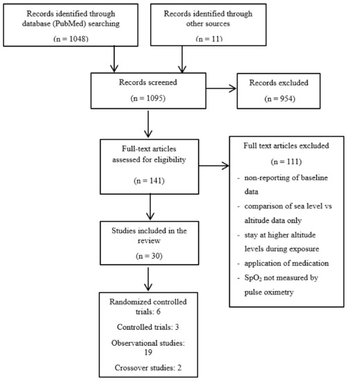 Part 2: In order to show the various changes in SpO2 and HR observed following acute exposures to altitude, the second part of this review presents the results of a literature search performed in the PubMed database including studies published prior to June 2020, using the search terms “oxygen saturation”, “heart rate”, “high altitude”, “acclimatization”, “exercise”, “performance” and “acute mountain sickness”. No restriction was done regarding to the type of studies. The search was complemented by articles known to the authors and by screening reference lists of selected review articles. Studies reporting SpO2 data from subjects acutely exposed to high altitude with subsequent active or passive stays were included in this review. Exclusion criteria included the absence of reporting baseline data on SpO2, the presentation of data obtained at sea level and once at altitude only, stays at higher altitude levels during the exposure, administration of medications as well as stays lasting less than 2 days and more than 28 days. Core findings of the presented literature overview are summarized. Figure 1 shows a flow chart of the selection process. Studies predominantly involved an observational study design.