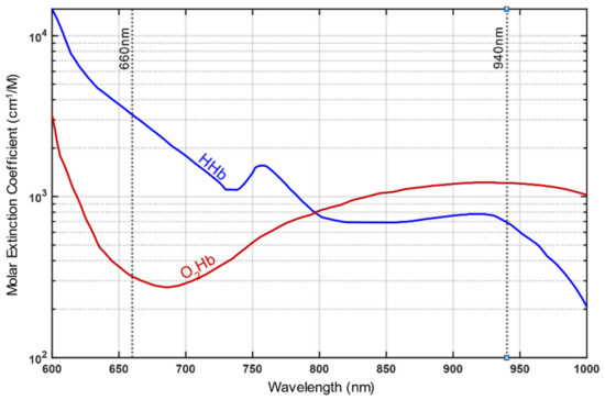 Light absorption spectrum of deoxyhemoglobin (HHb) and oxyhemoglobin (O2Hb). Different absorption for HHb and O2Hb at red light (660 nm) compared to infrared light (940 nm) is visible. (This Figure is based on data from Prahl, 1998 [20]).