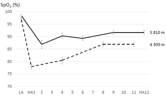 Example for changes of peripheral oxygen saturation (SpO2) when acutely ascending from low (LA) to high altitude (HA) and during the subsequent 11- or 12-day acclimatization period based on 2 studies performed at different altitudes (3810 m and 4300 m) [65,68]. At 3800 m, resting SpO2 was measured in a semi-supine position, with head and trunk elevated ~30°, by finger pulse oximetry (Criticare, 504-US pulse oxymeter). At 4300 m, resting SpO2 was measured in a sitting (upright) position for a 4-min period after relaxing for 20 min, by ear oximetry (Hewlett-Packard 47201A ear oximeter, Palo Alto, CA, USA).