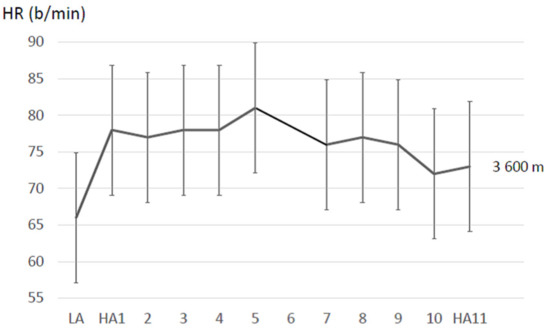 Changes in resting HR during the stay at altitude are mentioned in 10 out of the 20 studies. An initial increase in HR of 8 bpm at moderate altitude was observed in the study implementing daily hiking activities, with only small changes during acclimatization (−1 bpm) [58]. In the three studies performed at 3400 m to 3500 m, HR increased by 14–21 bpm, remained elevated when trekking exercise was performed during the stay [64] and decreased during acclimatization by −6 bpm after 5 days [62] and by −20 bpm after 9 days [60]. At altitudes >5000 m, the initial increases in HR ranged from 9 bpm to 25 bpm, whereas changes during acclimatization phase ranged from −1 to −9 bpm [69,70,71,72,73].