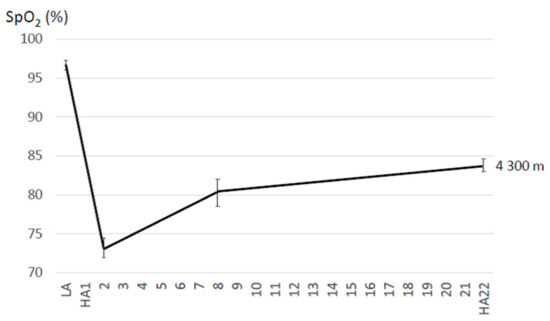 Example for changes of peripheral oxygen saturation (SpO2) during submaximal exercise when acutely ascending from low (LA) to high altitude (HA) and during the subsequent 22-day acclimatization period based on a study performed at 4300 m [68]. Resting SpO2 was measured in a sitting (upright) position for a 4-min period after relaxing for 20 min, by ear oximetry (Hewlett-Packard 47201A ear oximeter, Palo Alto, CA, USA).