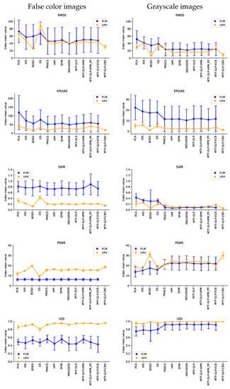 Graphic representation of computed quality indices. The different indices have been categorized in false color and grayscale. Dots represent quality index value, and vertical line length shows sample standard deviations. Graphics in ERGAS row are not directy comparable due to different y-axis scale.