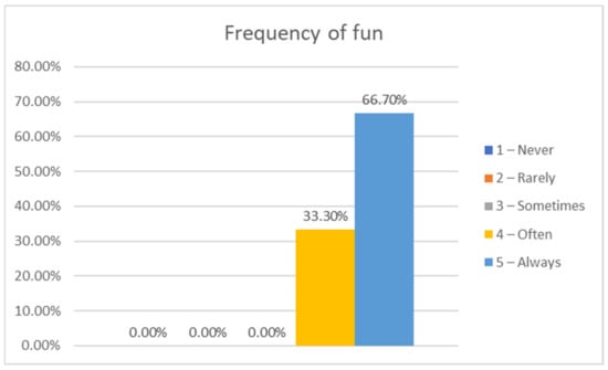 During the group sessions, we carried out training sessions about healthy habits (diet and physical activity), and all the games were designed around these topics. In terms of learning during the sessions, participants felt that they had learned moderately (16.7%), very (41.7%) and extremely well (41.7%). Therefore, we observed a high level of perceived learning (83.4%). Likewise, we asked them if they thought the learning obtained was useful, and 66.7% thought it was, 25% were neutral, and 8.3% disagreed with the statement. On the other hand, we asked them if they had learned about healthy living habits, with 91.7% answering that they had learned healthy living habits and 8.3% being neutral to this statement. The learning level on healthy habits was on average 3.58 (1—not at all, 5—extremely). No significant difference between girls (3.57) and boys (3.60) was found.