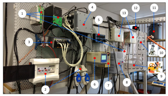 Front view of the agricultural sprayer development system (ASDS) electro-hydraulic devices: (1) power supplies, (2) electrical protection circuits, (3) modules for automation and control of input and output variables, (4) box with electronic circuits for signal conditioning, (5) CAN network bus, (6) transmitter for analog sensors, (7) frequency inverter for control of the spray pump, (8) frequency inverter for the control of industrial belt that simulates tractor movement in relation to sprayers, (9) spray pump, (10) two piston pumps for the injection of pesticides, (11) pesticide reservoir tank, (12) proportional valves for pressure and flow control, and (13) valve actuation circuits operated via CAN network.