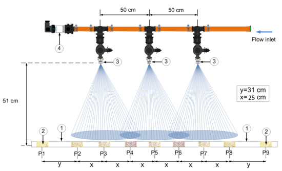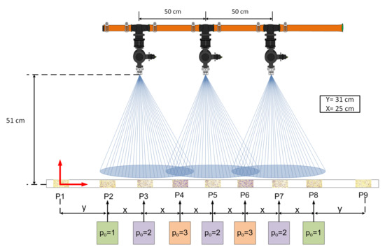 Water-sensitive papers of size 7.68 cm (2.50 cm × 3.07 cm) were used to collect the drop size distribution pattern. This paper collects watermarks produced by the drops, which can be analyzed using a pattern recognition program to obtain the average diameters. A detailed diagram of the experimental setup is shown in Figure 6. The water-sensitive papers were displayed on an aluminum bar, with an impermeable paint coating that is positioned transversely to the movement of the application and spaced to collect all information from the drop distribution of all nozzles. The spraying was performed at a height of 51 cm. The distance between each nozzle was set to 50 cm (Figure 6) [33].