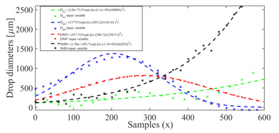 The Rosin–Rammler distribution allows for the extrapolation of data in the range of very fine drops, where measurements are more difficult and less precise [23]. The advantage of using known distribution functions is that we can easily find mathematical relationships between different diameters; for example, in the Rosin–Rammler distribution, the relations are made as a function of the drop size distribution parameter q. Therefore, the rate between SMD and VMD can be related as follows [24]: