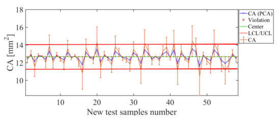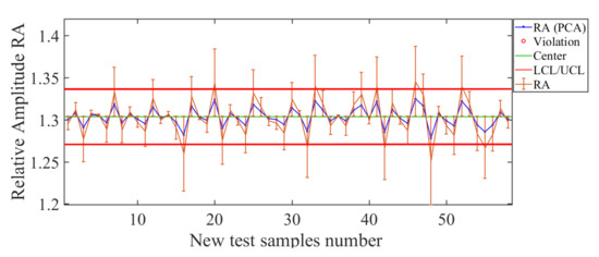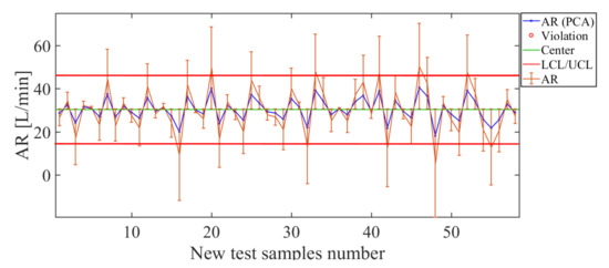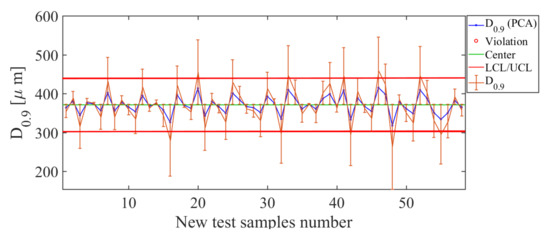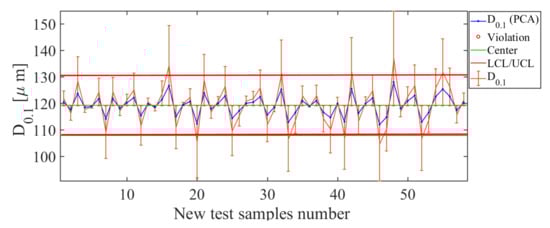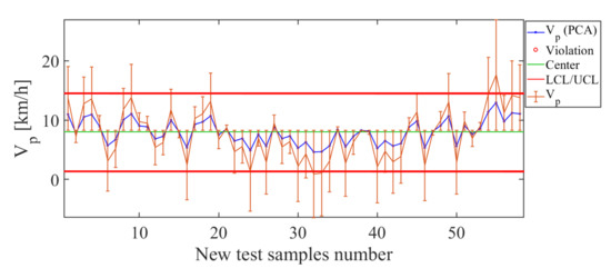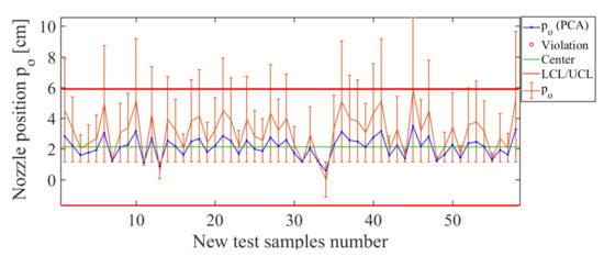 Finally, the operating condition to be analyzed in such an arrangement is position of the nozzle along the sprayer boom, for which the results are shown in Figure 22. Here, the control chart has been estimated by using PCA and the operating condition . The error bars have values smaller than 9.32%, which confirms the acceptable estimation level for the operating condition . The total deviation of the error for this soft sensor is cm, which is low, considering that the distance between each position considered was about 25 cm. Therefore, such results indicate that the soft sensor based on the use of PCA actuated as a good estimator for the nozzle’s position in the sprayer’s boom.
