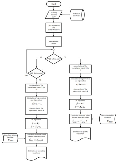 As a result of the analysis presented, the implementation of the soft-sensor based on PC regression was performed as in Figure 23. The construction of the soft sensor thus begins with the entry of the historical data corresponding to the training matrices of quality descriptors and operating conditions . Next, data exploration is carried out in order to recognize the nature and to detect the possible outliers of the data. Identifying the nature of the data history, an interpolation is performed to increase the amount of data to analyze and to develop the soft-sensor. Then, the execution comes down to the choice of the type of output information required from the soft sensor, and the coovariance matrix as well as its representative eigenvectors and eigenvalues, are computed. Finally, the soft sensor delivers the information required for each case by executing the procedures presented in the flow chart in Figure 23 and explained in more detail in Section 2.3.