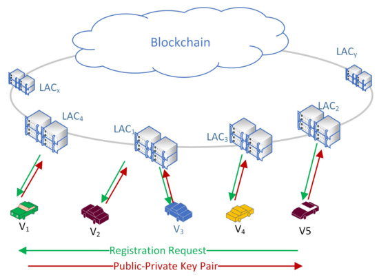 All of the IoVs register to their Local Authentication Centers to participate in the VANETs. LACs are responsible to generate public-private key pairs for them and to preserve their privacy, IoVs will use their public keys as the identity for all types of communications. LACs will register IoVs with all required information and generate a blockchain transaction to store those in the database. All of the LACs of a state or country will get the information immediately as a member of the blockchain. All the LACs preserve a copy of all registered IoVs’ information to form a distributed and decentralized system. The registration process is illustrated in Figure 1.