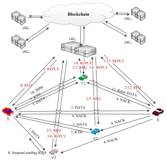 - Even after T sender can receive KTH, which also provides information about a failed transmission. From the KTH, the sender checks the authenticity of only the optimal helper i.e., the one that has the lowest SINR from the blockchain server. Then, S sends SHM to the helper by including NACK-ID, sender, receiver and selected optimal helpers’ public keys. The sender stops receiving KTH from any other IoVs after sending the SHM.