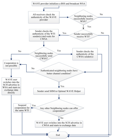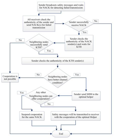 - For every fail transmission, there will be different NACKs and, based on SINR between the helpers, it may be different for the same receiver. The cooperation is initiated by the receiver, which ensures that cooperation is performed only when necessary and to ensure the reliability of the communication. A blockchain based authentication service ensures that no unauthorized or fake IoVs can interface with the communication. In Figure 4, a flow chart is given to show the steps.