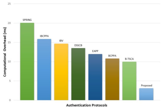 Traditional ECDSA is utilized by Lin et al. in their proposed BCPPA protocol, where it requires 3.6 ms to sign and 7.2 ms to verify, i.e., 10.8 ms to complete their authentication process [24], which is approximately three times more than the proposed protocol. Several certificate-based and other types of authentication methods have been proposed previously, which also require comparatively higher time than our proposed method. For example, proposed authentication protocol by Wang et al. (B-TSCA), Azees et al. (EAPP), Zhang et al. (DSSCB), Zhang et al. (IBV), Shao et al. (IBCPPA), and Xrongxing et al. (SPRING) required 10 ms, 12 ms, 13.5 ms, 14.7 ms, 15.9 ms, and 20.1 ms, respectively [13,22,25,26,27,28]. Comparison between these protocols are illustrated in Figure 10.