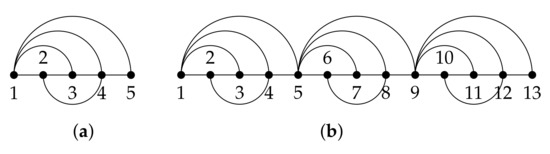 We refer to a periodic graph as a graph where a given pattern or basic graph is repeated several times across the graph. As a toy example, the graph in Figure 2a shows the basic graph given by with vertices, while the one in Figure 2b is a periodic version of with replicas and vertices denoted by .