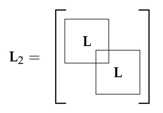 The Laplacian matrix of is denoted by and is built by sliding the Laplacian matrix of , denoted by L, positions across its diagonal as many times as replicas of the basic graph includes . Figure 3 shows the resulting Laplacian matrix of a periodic graph using replicas. Clearly, the entry overlaps with , meaning that the Nth vertex of increases its degree with respect to the Nth vertex of by summing up the neighbors of vertex 1. If P replicas were present in the periodic graph, the vertices indexed by would increase its degree by . Without loss of generality, we assume that the vertex of the basic graph selected to concatenate the pattern is indexed by node N.