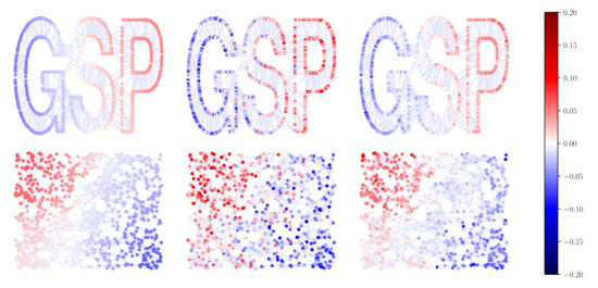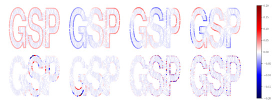 First of all, we present a simple visual example to show the spectral properties of provided in Section 3.2. Figure 4 depicts the eigenvectors {, , , , , , , } of for the GSPlogo graph [28] ordered according to the absolute value of the associated eigenvalue and represented as graph signals. The GSPlogo graph is an undirected connected graph with nodes and edges. Clearly, the smaller the absolute value of an eigenvalue is, the smoother the associated eigenvector varies across the graph. Furthermore, the eigenvector associated to is an all ones vector.