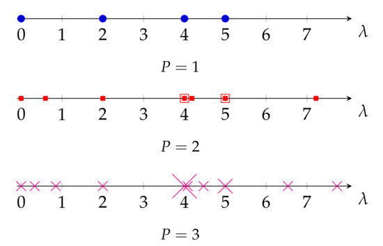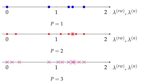 Interestingly, in Figure 7 we also observe that a periodic graph with P replicas inserts additional eigenvalues between two consecutive eigenvalues of . This is a kind of nonuniform upsampling in the frequency domain of the graph, and translates into an increase in the frequency resolution of the graph. Remarkably, as it can be seen in Figure 6, this is not the case for the eigenvalues of L, as some of the new eigenvalues of are outside the range of eigenvalues of L. On the other hand, as , the normalized Laplacian matrix also presents the same upsampling in the frequency domain when a graph is replicated. However, as discussed in Section 3.1 and evidenced by (16), the eigenvalues of the normalized Laplacian matrix do not properly measure smoothness of their associated eigenvectors as those of the random-walk Laplacian do.
