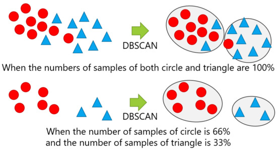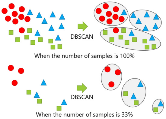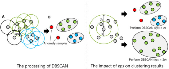 - Ester, M.; Kriegel, H.P.; Sander, J.; Xu, X. A Density-Based Algorithm for Discovering Clusters in Large Spatial Databases with Noise. In Proceedings of the Second International Conference on Knowledge Discovery and Data Mining, KDD’96, Portland, OR, USA, 2–4 August 1996; pp. 226–231. [Google Scholar]