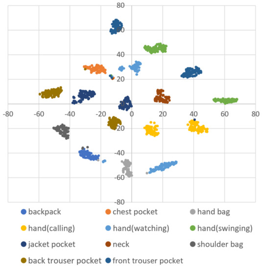 | Fujinami et al. [4] | Neck (hanging), chest pocket, jacket pocket, front/back trouser pocket, bag (backpack, hand bag, and shoulder bag), and hand (calling, watching the screen in the portrait direction, and swinging during walking) |