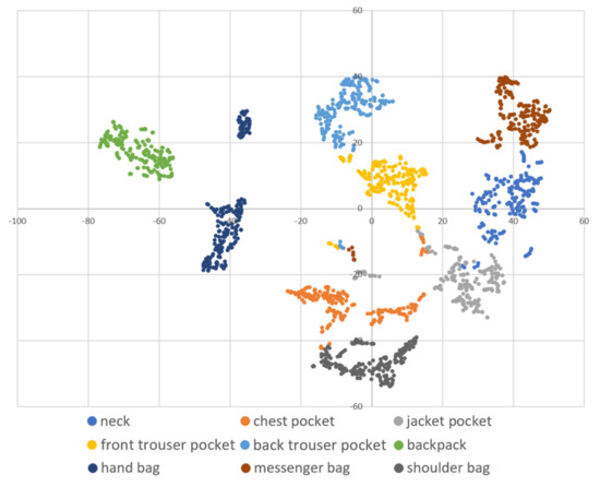 | Fujinami [23] | Neck (hanging), chest pocket, jacket pocket, front/back trouser pocket, and bag (backpack, hand bag, shoulder bag, and messenger bag) |