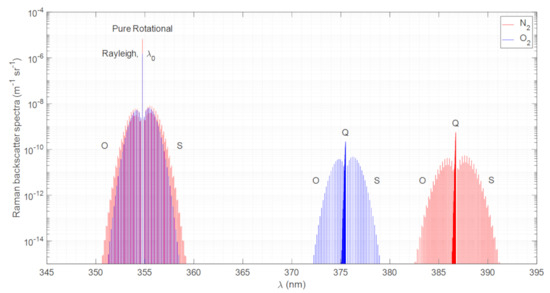 The lidar system used in this work employs a Nd:YAG (Neodymium-doped Yttrium Aluminum Garnet; Nd:Y3Al5O12) laser with a fundamental wavelength at 1064.28 nm. The second and third harmonics are thus expected at 532.14 nm and 354.76 nm, respectively [18]. Considering the third-harmonic excitation wavelength, λ0, of 354.76 nm and a temperature of 300 K, the computed Raman backscatter spectra for the PRR and the VRR contributions of N2 and O2, according to the Appendix A formulas, is shown in Figure 1 for 300 K temperature and standard sea-level pressure. The total contribution of the resulting intensities, calculated by the summation of the spectral lines for the PRR (O & S branches) and the VRR (O, Q & S branches) spectra, are given in Table 1. The ratio between PRR and VRR intensities from the backscatter spectra, PRR/VRR is 21.21 and 37.03 for N2 and O2, respectively.